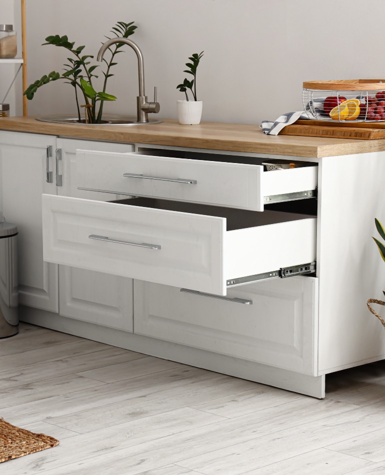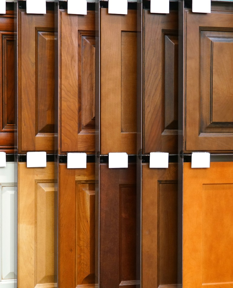 Unlike with “pre-fab” pieces, we let you choose every detail from start to finish. When comparing bids, make sure that countertops, hardware, installation and crown molding are included, that countertops are one piece and details like hidden hinges come standard.